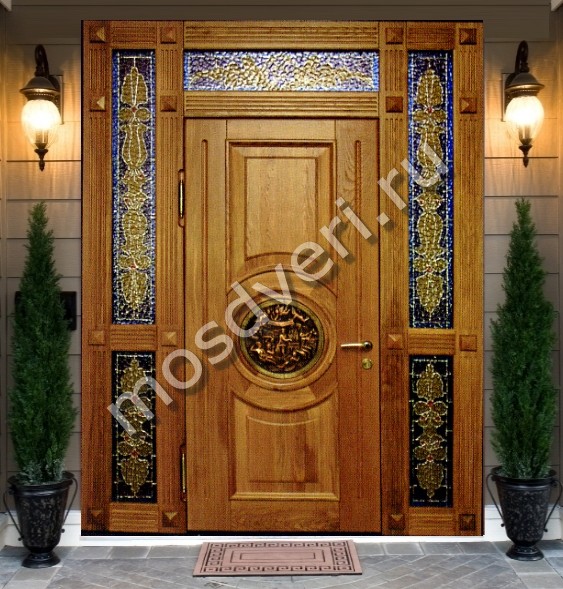 Парадная дверь в дом из массив дуба со стеклопакетом, ковкой и резьбой по дереву